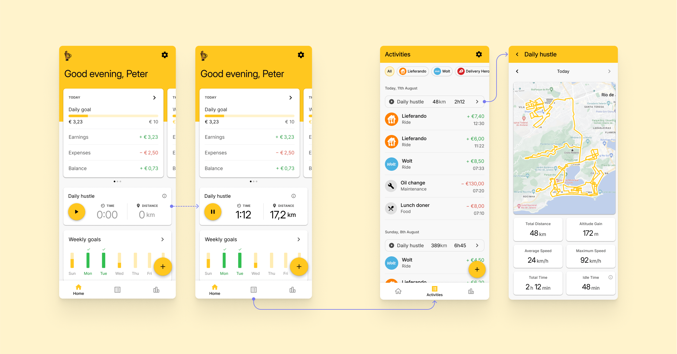 The winner concept was the “Financial Strava”, a kind of app that would merge the popular sports-tracking app Strava with the specificities of their work as delivery workers. The user would add their earnings and expenses to the app, which would help them track their daily and weekly goals and calculate some personal performance metrics.